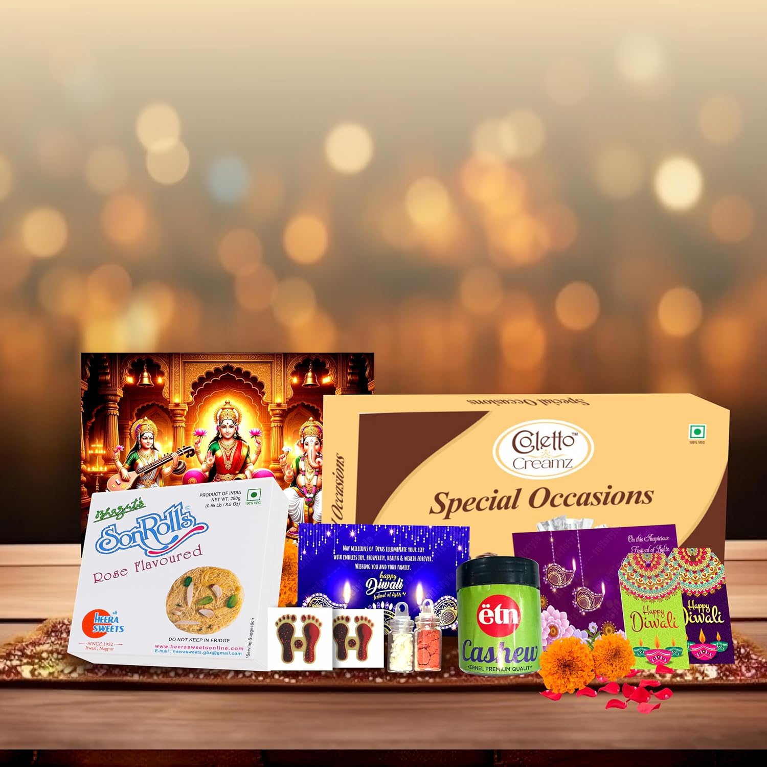 Festive Gifting Excellence – traditional sweets + puja essentials like Roli‑Chawal jar and Laxmi Pratima photo for Diwali puja rituals. Includes ETN Dry Fruits Mix Mini Jar – healthy, premium dry fruit mix to complement sweets and elevate festive nutrition.