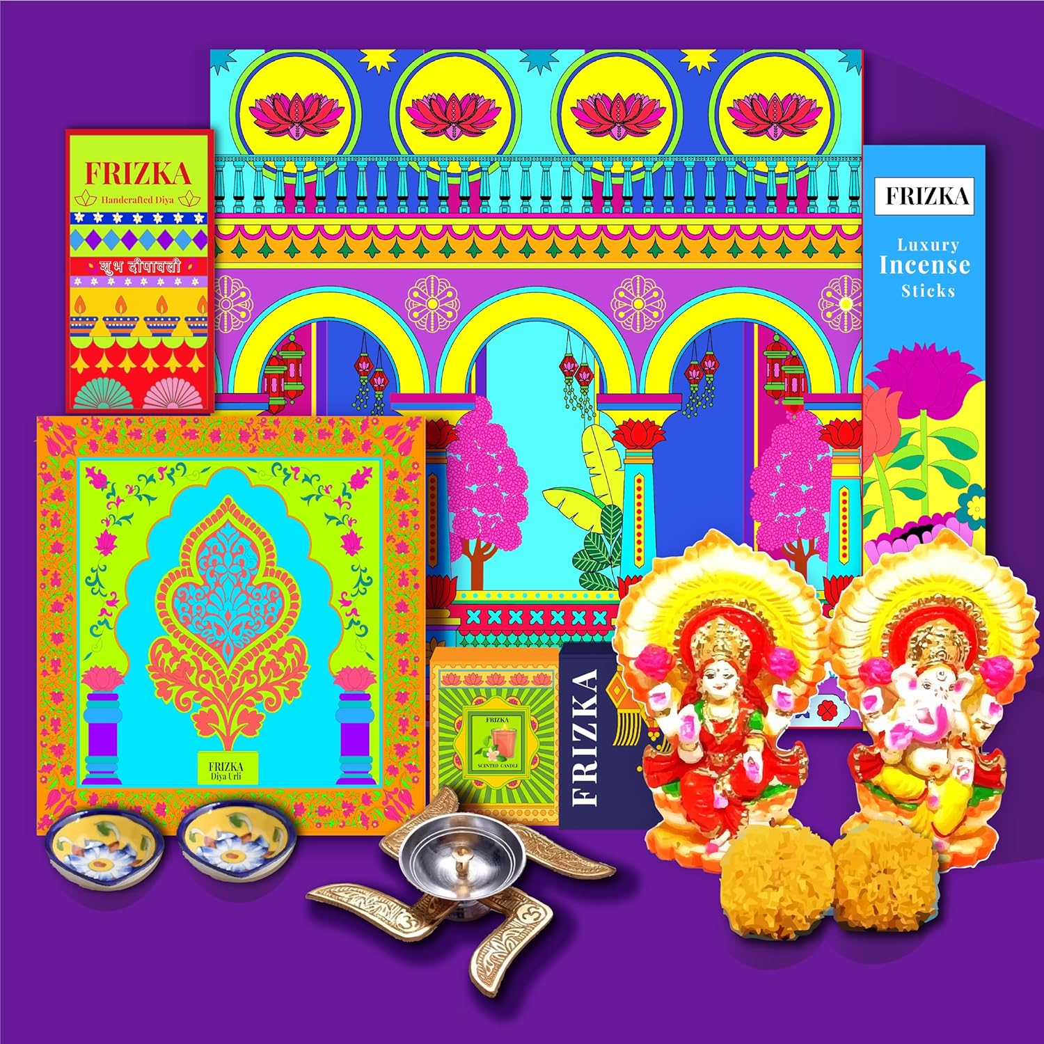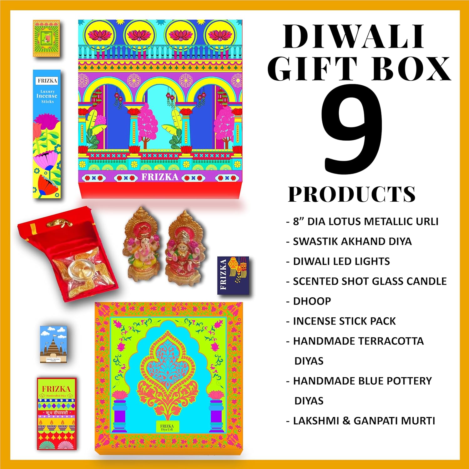 Frizka Diwali Box | Festive Pooja & Décor Gift Set (Set of 9 ) Bring home divine blessings and festive elegance with the Frizka Diwali Box, a thoughtfully curated set of handcrafted idols, traditional diyas, fragrant incense, and decorative lights. Perfect for Diwali puja, home décor, and gifting.