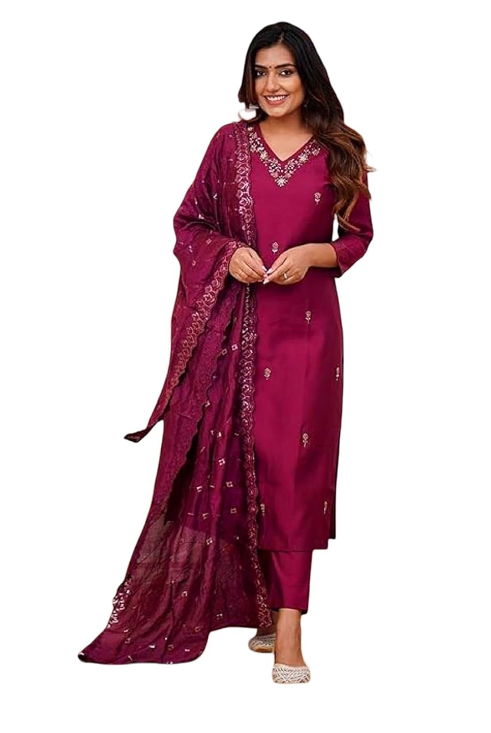 Color: Rich magenta for a vibrant, festive appeal Design: Elegant embroidery on the neckline and dupatta Fabric: Soft, breathable fabric for all-day comfort Set Includes: Kurta, matching bottom, and embroidered dupatta