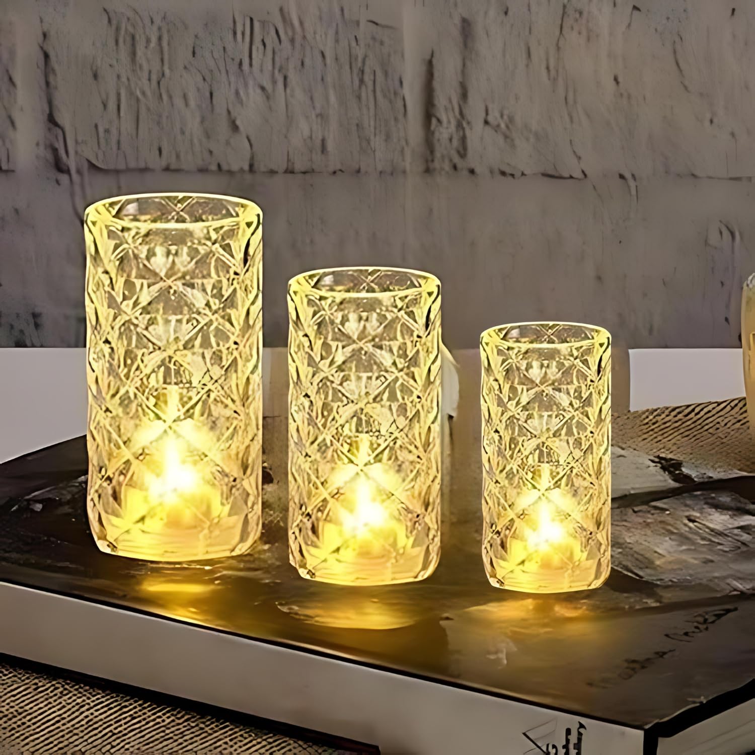 Package Includes 🎁: Set of 3 diamond-shaped candles in sizes 9 cm, 7 cm, and 5 cm. Warm white LED light for a cozy ambiance.